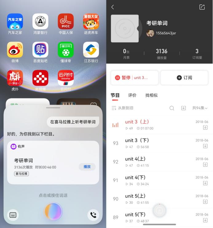 再说说听课这事儿,碎片时间千万别浪费。我每天早起会抽一小段时间跑步,这时候我就会用鸿蒙版喜马拉雅听听考研单词,不用动手找,直接对小艺说:“小艺小艺,在喜马拉雅听考研单词”,它立马就能搜索到对应的内容,点开就能听。更优秀的是,鸿蒙版喜马拉雅还支持统一媒体播控,在桌面、控制中心和锁屏界面上,都能直接控制播放暂停、切换音频,不用解锁手机,跑步时也方便。跑完步回到家把手机轻靠平板,点一下平板上的应用图标,进度就会通过跨设备接续功能自动续到平板上了,小艺建议还会贴心地智能提醒续播,下次接着听也方便。