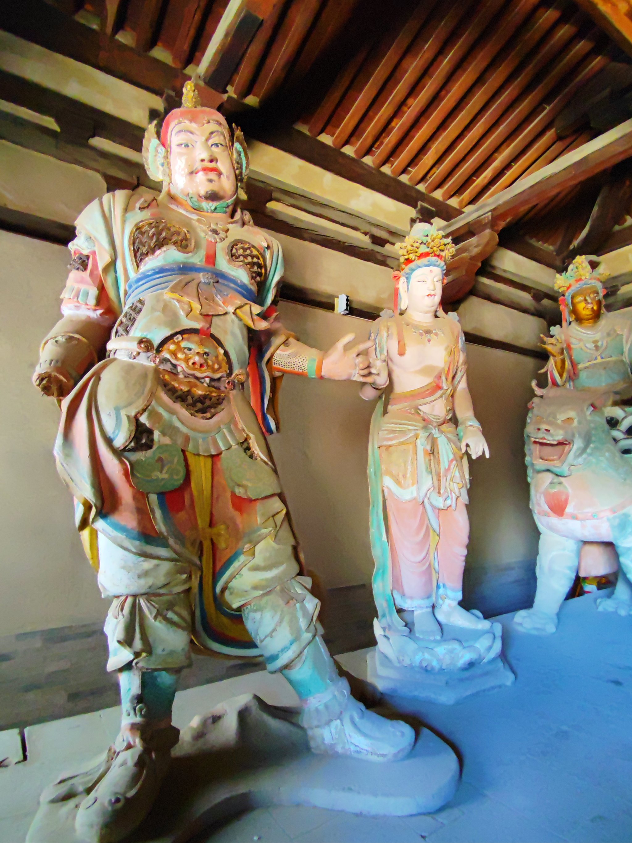 唐代建筑探秘:“中国第一唐建”——大雄宝殿“斗拱”为唐代原物,出檐深远如鸟翼,讲解员说“这斗拱不用一根钉子,全靠木头‘咬’在一起,比现代工艺还精巧”;殿内“华严三圣”彩塑(中为毗卢遮那佛,左文殊、右普贤),衣纹流畅如“风吹袈裟”,是唐代雕塑“吴带当风”的典范;