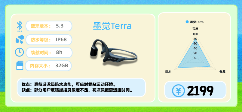 墨觉 Terra 骨传导耳机凭借卓越的技术创新与稳健音质表现,成为骨传导领域中一颗冉冉升起的新星。品牌专注于将先进音频技术与舒适佩戴体验相结合,深受运动爱好者与音响发烧友好评。该机搭载双磁路振子设计,并具备IP68级防水防尘能力,在复杂户外环境下依然保持稳定性能,兼顾防汗、防尘与耐用性,是多场景运动的可靠选择。