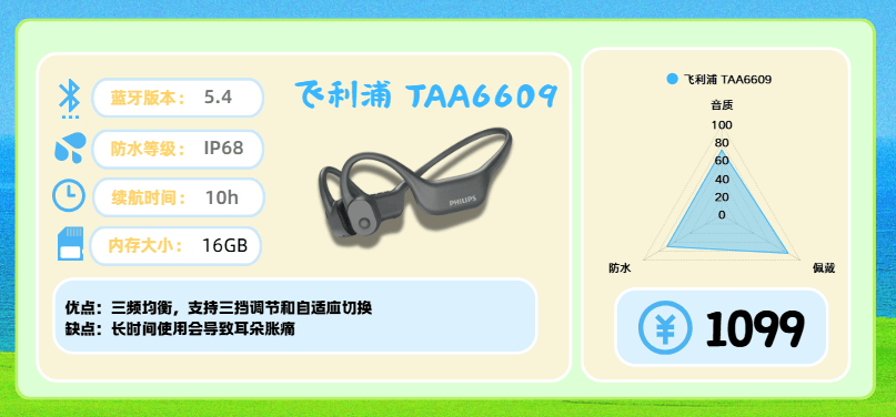 飞利浦(PHILIPS)TAA6609 骨传导蓝牙耳机延续了飞利浦在声学领域的百年技术积淀,凭借圈铁结合音频结构与专业声学调校,在骨传导耳机市场中树立了高端典范。作为一款主打运动与高保真音质的产品,它兼顾安全开放听感与出色防水性能,适合热爱运动、追求音质的用户群体。