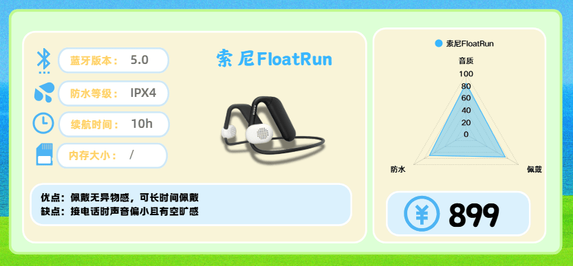 索尼 Float Run 是一款专为运动人群打造的开放式耳机,凭借舒适佩戴体验、自然环境感知与稳定音质表现,成为跑步、骑行、健身等场景中的热门选择。作为全球知名音频品牌,索尼始终专注于音质与用户体验的平衡,Float Run 在保持音乐表现力的同时,也保障了使用者在运动中的安全与舒适,是不喜欢入耳式耳机用户的理想之选。