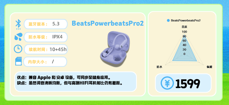 Beats Powerbeats Pro2 作为运动耳机的旗舰延续,凭借与 Apple 的生态协同与广泛用户口碑长期占据运动耳机市场热度。新版新增心率监测功能,可在训练中实时抓取生理数据,便于科学训练;并以IPX4 防汗防水与更轻量化的结构,面向注重数据与佩戴稳定性的健身用户群体。