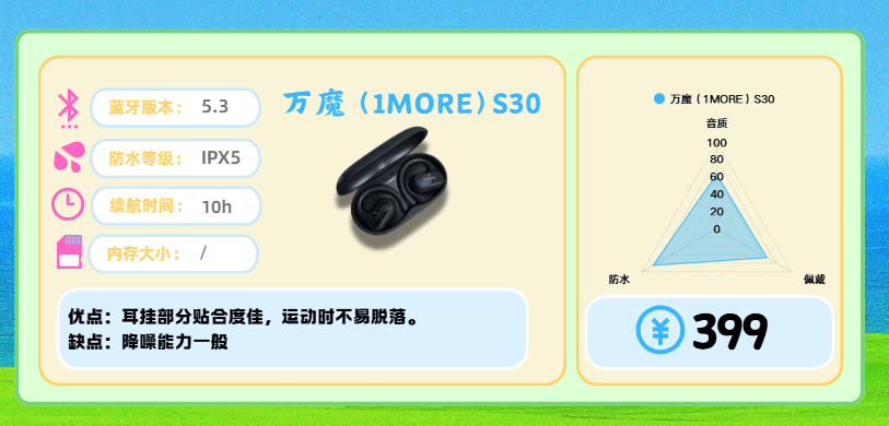 音质方面,S30 搭载 14.2mm 大动圈单元,并配合万魔自研的 低频增强算法 与声学腔体调校,使开放式结构下依然能呈现清晰通透的高频与富有弹性的低频。整体三频均衡、细节稳定,适合流行、运动节奏类播放,满足日常听歌与播客需求。