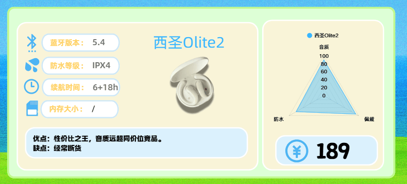 佩戴与体验方面,Olite2 采用不入耳开放式结构,搭配符合人体工学的耳挂设计与一体化轻量机身,佩戴轻盈且通风,长时间听感不闷热。凭借 蓝牙5.4 芯片,连接更稳定且端到端延迟低(约 60ms),游戏与视频体验流畅。再加上IPX4 防水等级,可应对汗水与小雨,是追求高音质与低延迟但预算有限用户的理想之选。