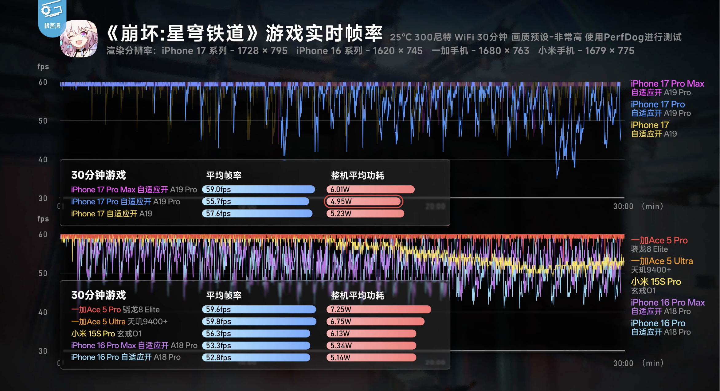 据极客湾的测试,在运行超高压场景的《崩坏:星穹铁道》半小时游戏,iPhone17 ProMax可以跑到几乎满帧的59高帧,功耗却只有6瓦出头,温度在43℃左右,比隔壁旧款安卓旗舰的功耗、温度低不少,这表现很不苹果了,看来苹果不是不想做散热,而是要做更好、更领先的散热,今年游戏党预算很多的可以看看新款iPhone了!