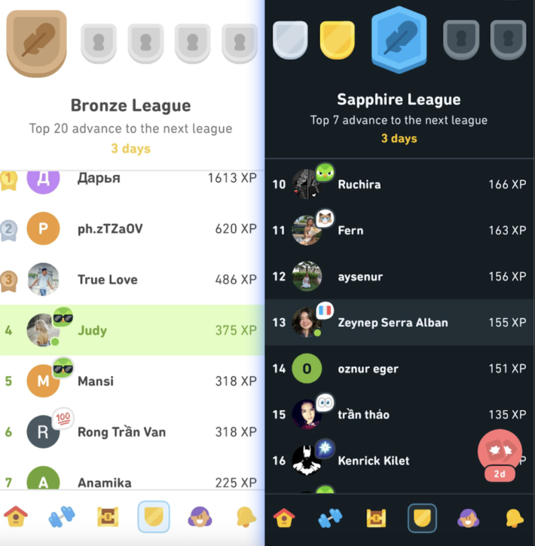 当看到自己的排名被好友超越时,强烈的竞争欲会驱使用户投入更多时间学习。正是这种机制,使得多邻国用户的日均学习时长超过23分钟,远高于行业平均水平。