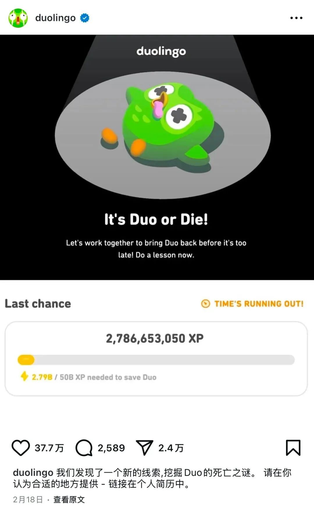 这场“死亡营销”迅速引爆网络,两周后,多邻国揭晓谜底:Duo只是“假死”,目的是为了激励用户完成学习任务来“复活”它。