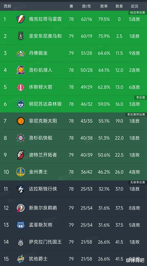 北京时间4月7日,今日的NBA常规赛并不多,只有5场比赛,我们看看出战西部球队的战况和最新积分榜变动!主要的信息是:马刺115-102战胜了76人稳居第二,掘金加时137-132险胜开拓者,灰熊126-142惨败骑士!