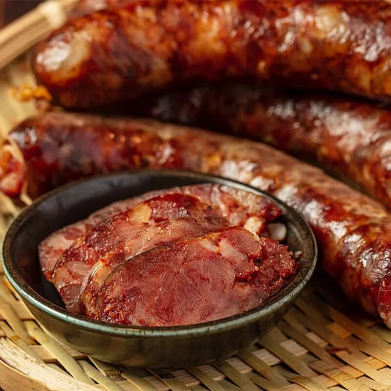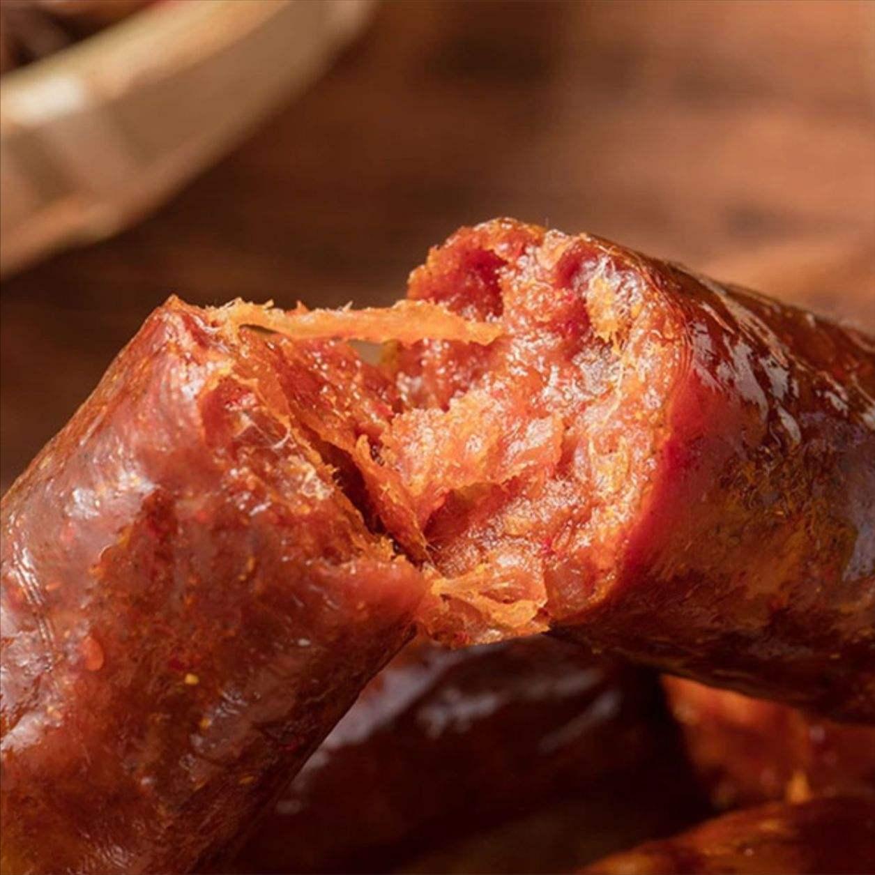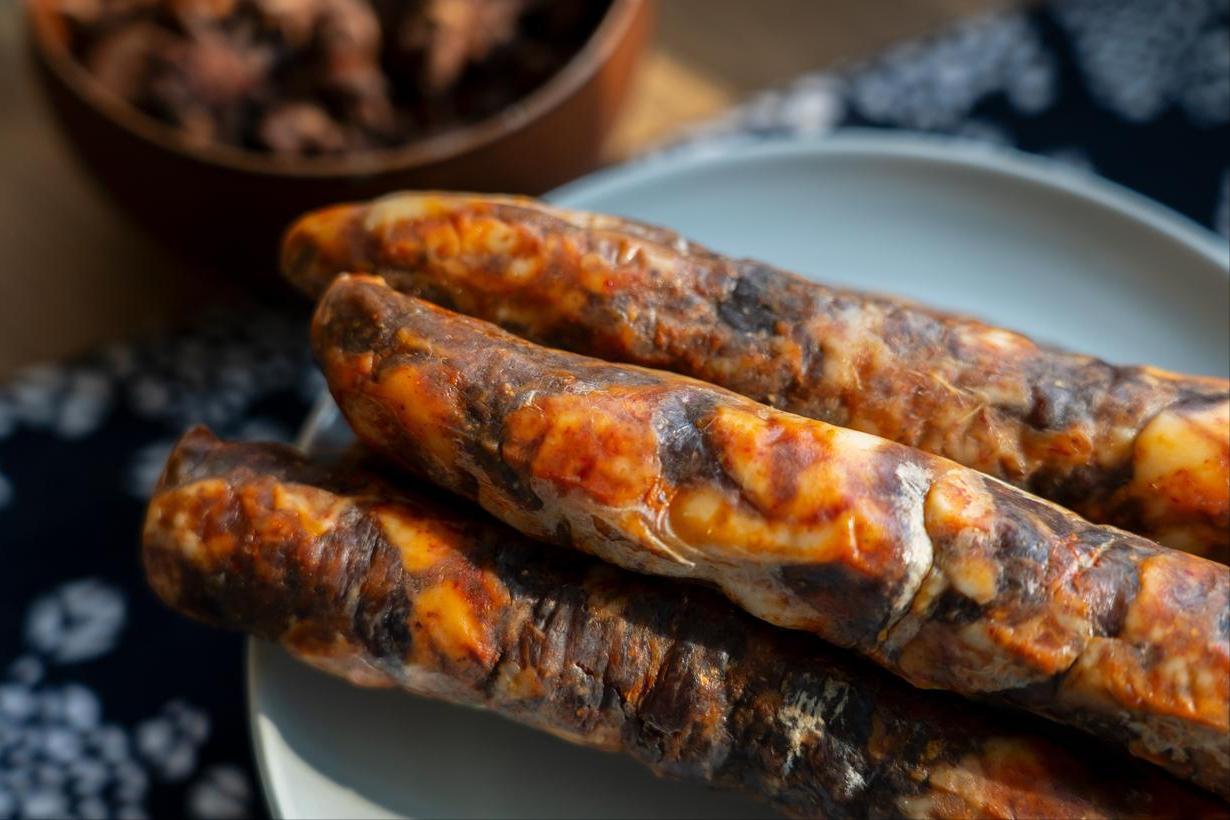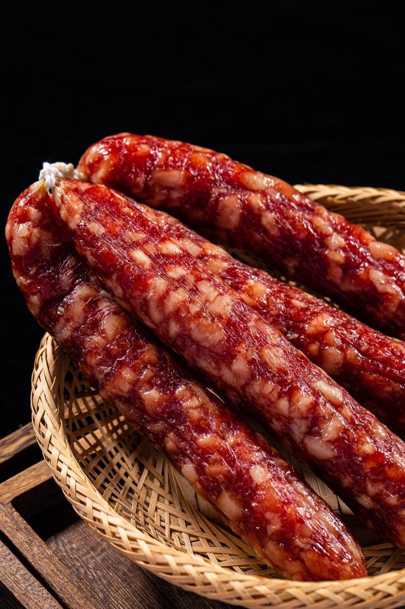 条形如弯月,肥瘦2:8黄金比,经盐糖曲酒腌渍,灌入32毫米肠衣,晒五日再阴干月余。