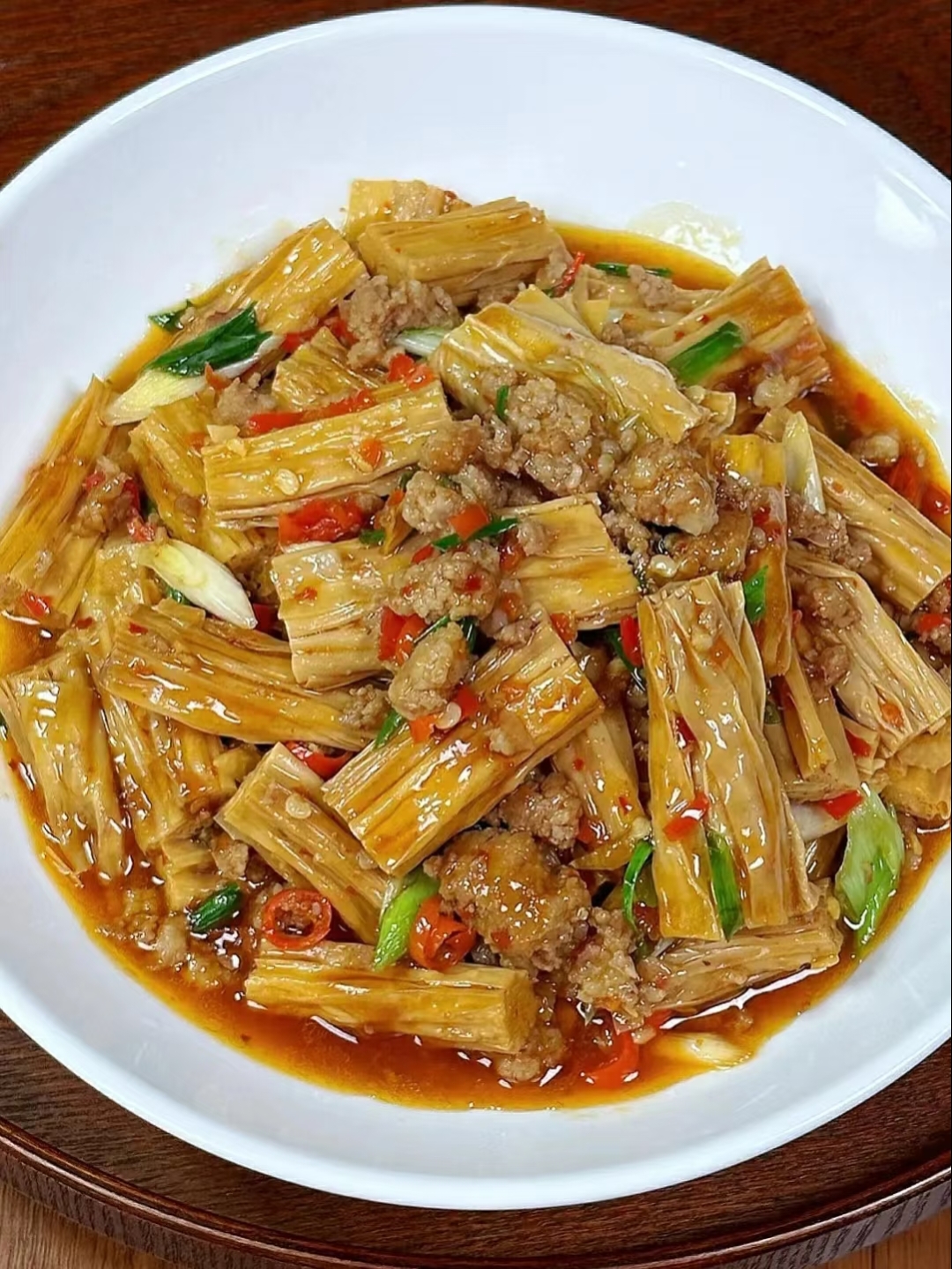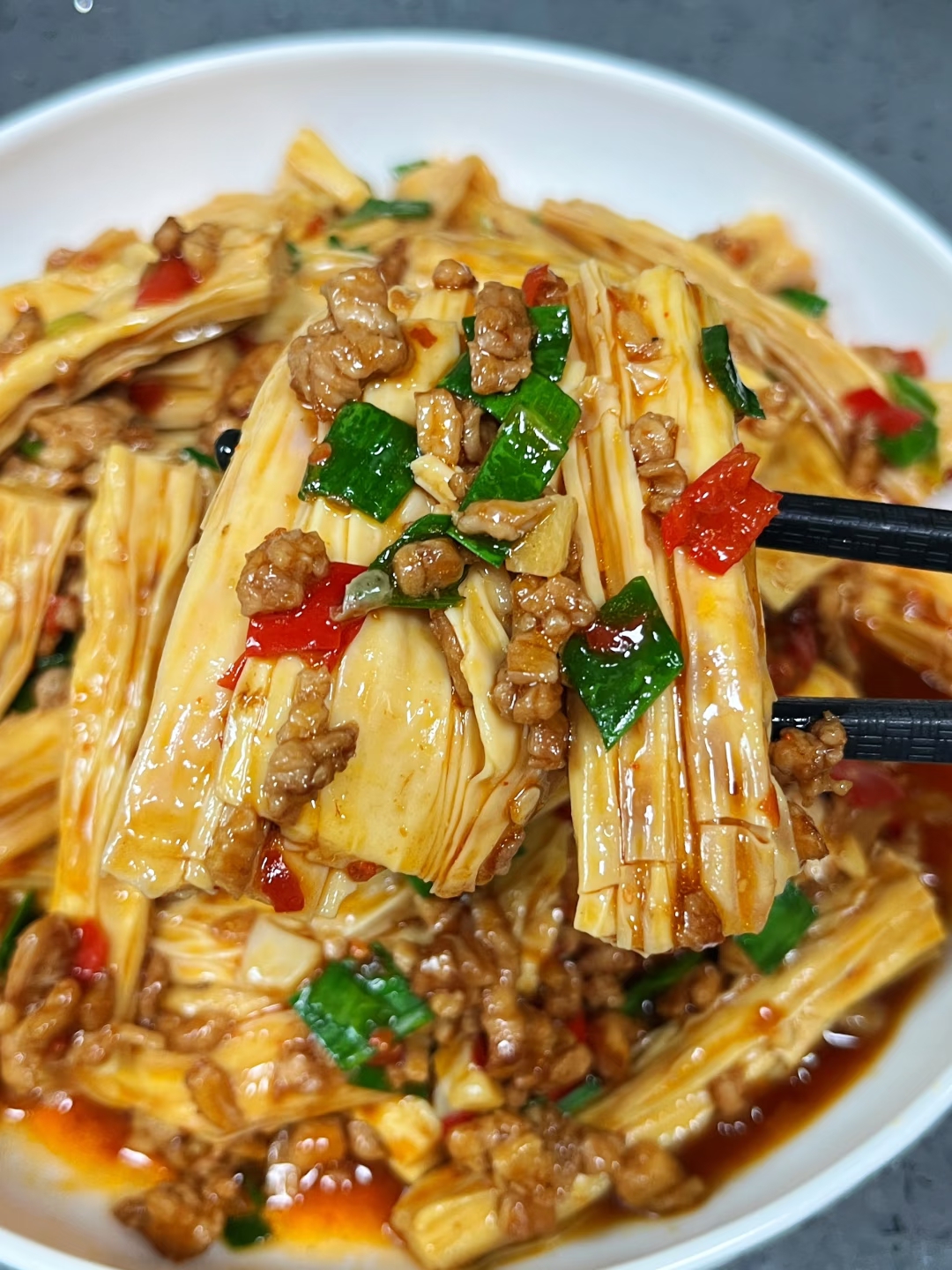 4. 汤汁交响曲:倒入半碗清水(刚好没过食材),放入焯好的腐竹段。大火煮沸后转中小火,盖上锅盖焖煮5分钟。这个过程中,腐竹会像海绵一样咕嘟咕嘟吸收汤汁,肉末的鲜味则悄悄渗入每根纤维。