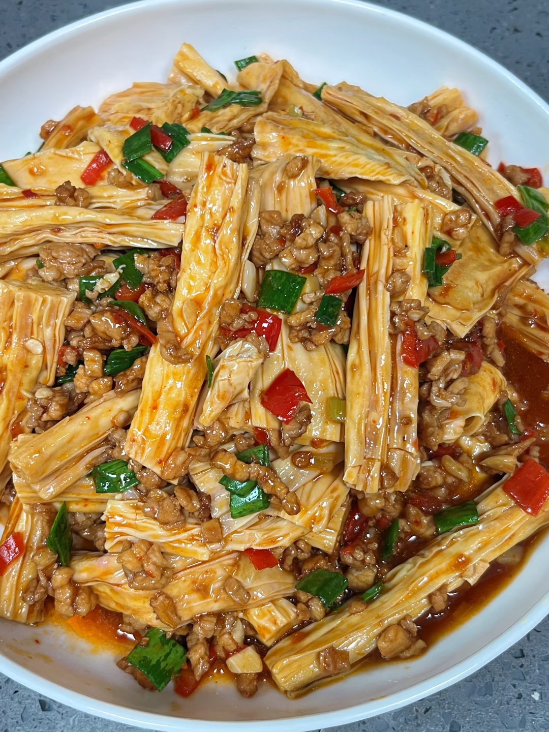 这道菜最神奇的地方在于它的包容性。嗜辣的朋友可以加勺剁椒,减肥人士能用鸡胸肉代替猪肉,连泡腐竹的水都能留着煮汤。有次朋友来访,我把剩下的肉末腐竹浇在面条上,居然发明了"豪华版阳春面",大家抢着舔碗的样子至今难忘。