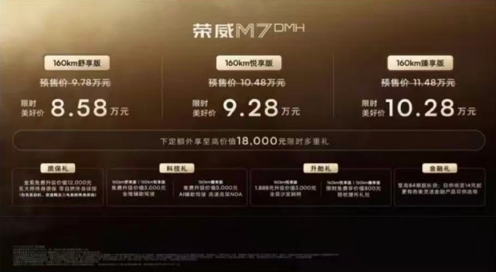 2025年9月17日,长续航中大型豪华轿车——荣威M7 DMH正式上市。新车共推出3款车型,官方指导价9.78万元-11.48万元;即日起至10月31日(含)前完成大定并锁单的用户,可享限时美好价[1]8.58万元-10.28万元,现在下定更可尊享至高价值18,000元的限时四重礼,包含“五大件终身质保”、“零自燃终身保障”等多重专属购车权益。
