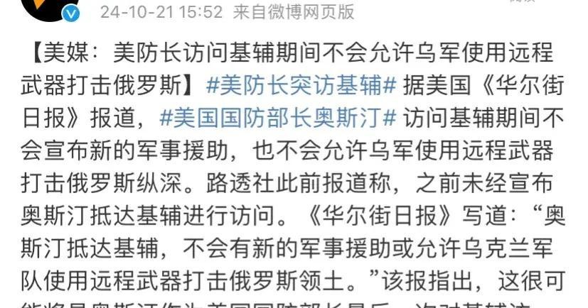 美国国防部长奥斯丁在访问基辅时,一反常态地表示,美国不会向乌克兰提供新的军事援助,也不会允许乌克兰使用远程武器攻击俄罗斯本土。