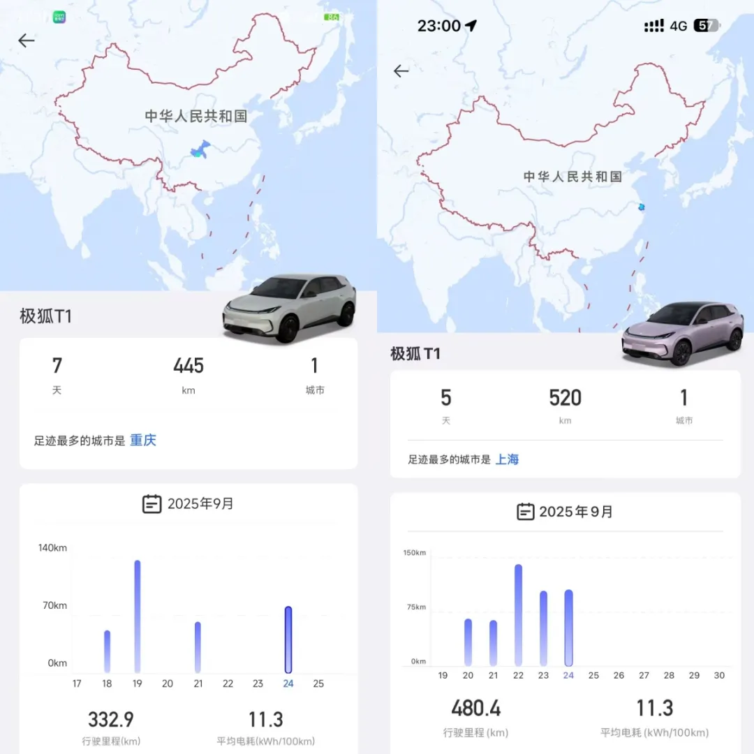 最后,来看看极狐T1车友群里一些车主的能耗分享吧: