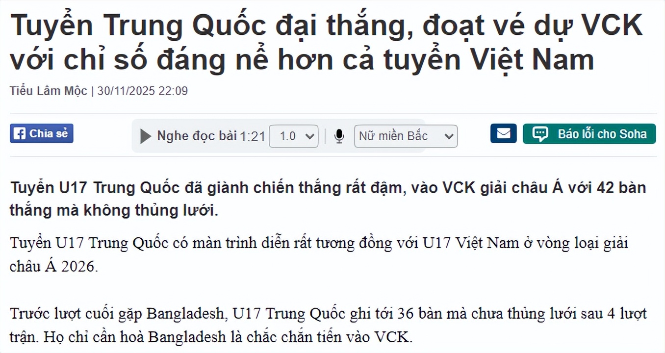 该越媒的标题大意是:中国U17大胜晋级,42粒进球和0失球的数据比越南U17更亮眼(上图)。文章开门见山地表示,中国队以42粒进球且未失球的成绩晋级到U17亚洲杯决赛圈,出线的过程跟越南U17队非常相似。