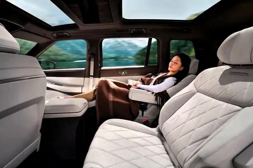舒适性配置更是“满级”:全车标配动态零重力座椅,主副驾、二排右侧座椅均支持160°躺平、12点式按摩、加热通风,搭配Nappa全粒面真皮(通过Oeko-Tex母婴级认证),触处皆奢 。开启“大床模式”,座椅秒变2米移动卧室,搭配智能婉风空调(无感出风、杜绝直吹)、双向冷暖冰箱(制冷-6℃至加热50℃)、ERA Sound 27扬声器音响系统(含4个独立头枕音响)、255色云镜氛围灯,长途旅途秒变移动奢享会所。
