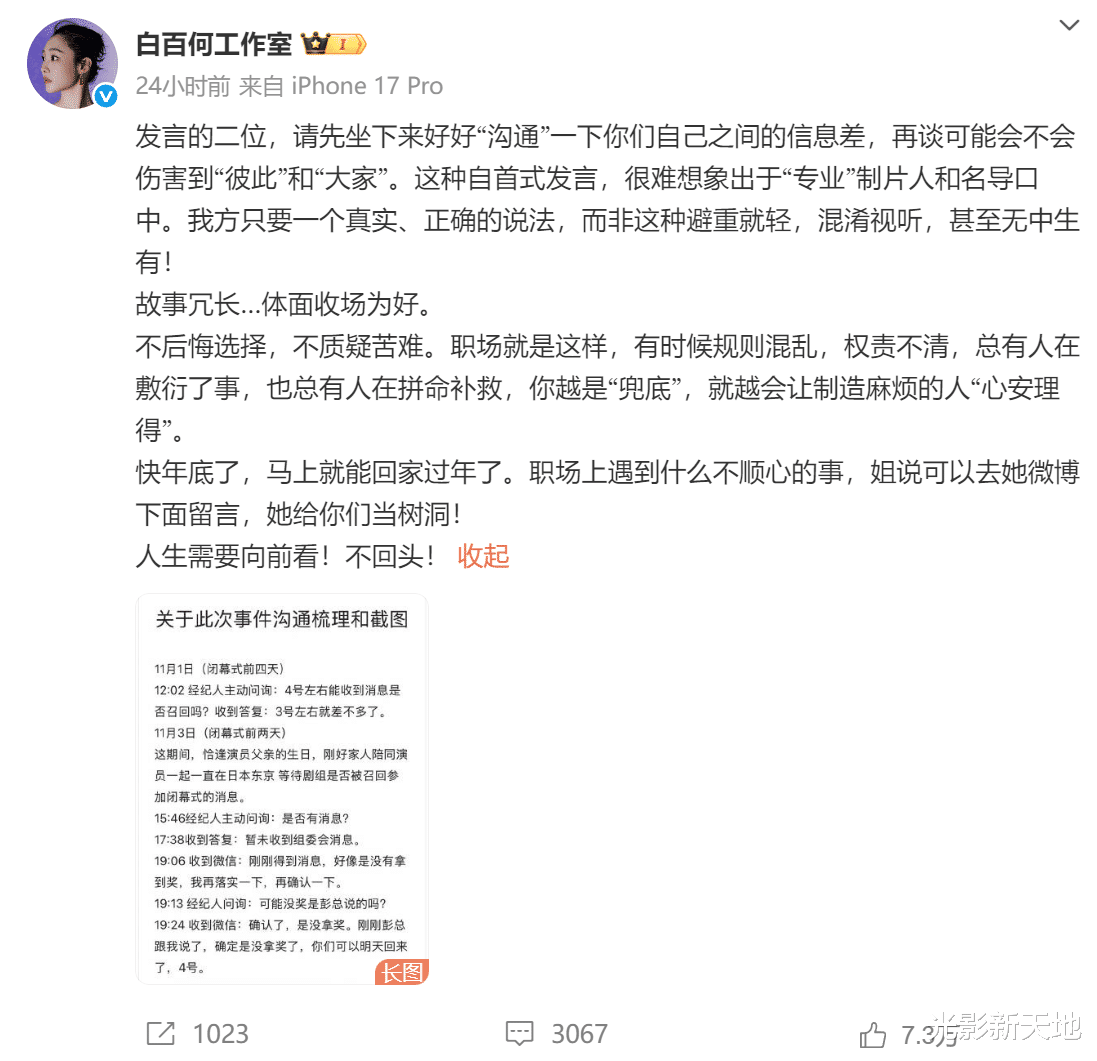 白百何方面晒出的聊天记录:11月3日双方持续沟通获奖事宜,晚上19:06时片方回复“刚刚得到消息,好像是没有拿到奖”,差不多20分钟后再次明确“确认了,是没拿到奖。”但到了20:06,确认了最佳导演和最佳男演员奖。
