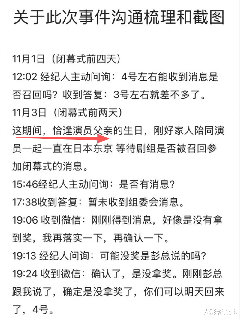 从时间线来看,11月3日从下午15:46开始,经纪人就一直追着片方问是否有获奖消息,从逻辑上说,获奖与否决定了白百何是否回国。
