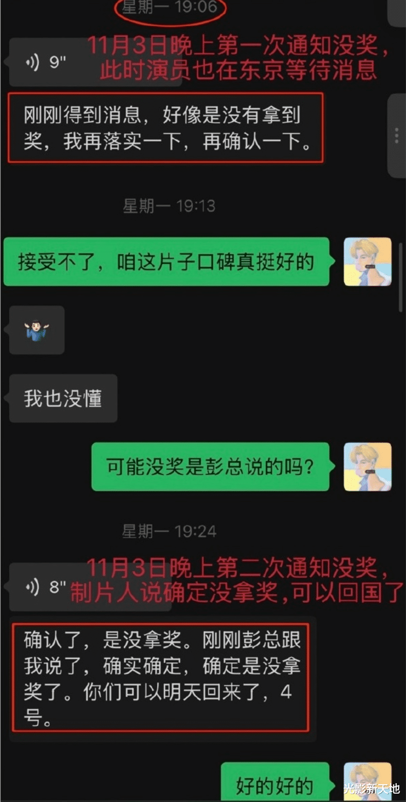 但直到晚上7点06分,片方才回复“好像是没有拿到奖”,之前说的都是没有消息。