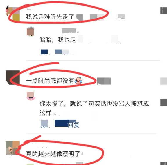 “我感觉现在和蔡明有点撞脸是怎么一回事?我在她身上没有看到任何的时尚感,可能是我说话比较难听,我还是先走”。