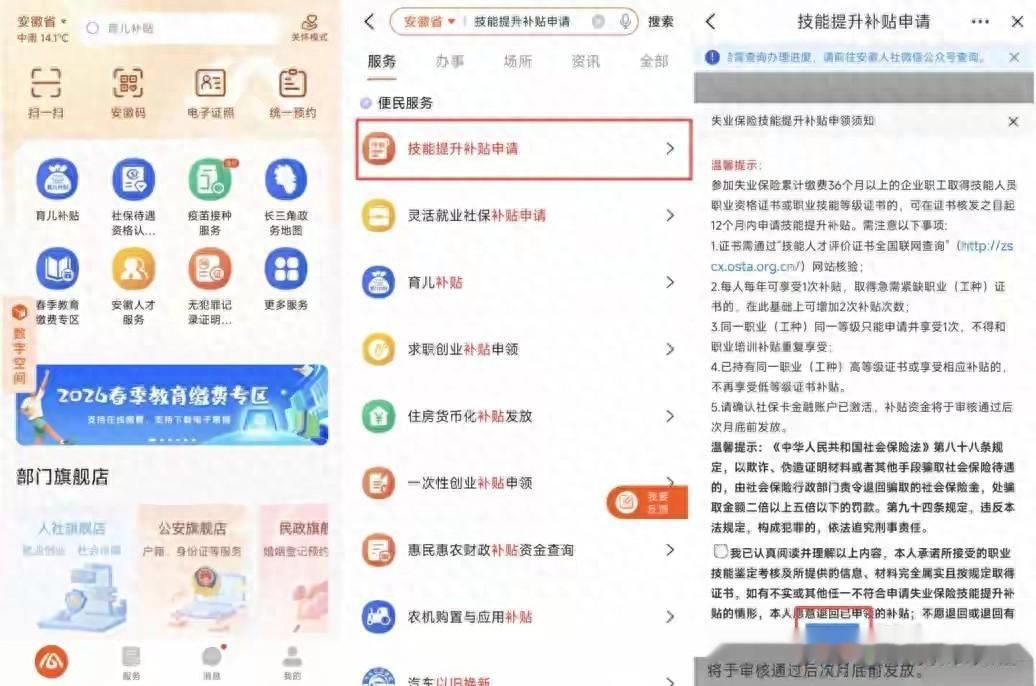 1. 打开皖事通→搜"技能提升补贴申请"