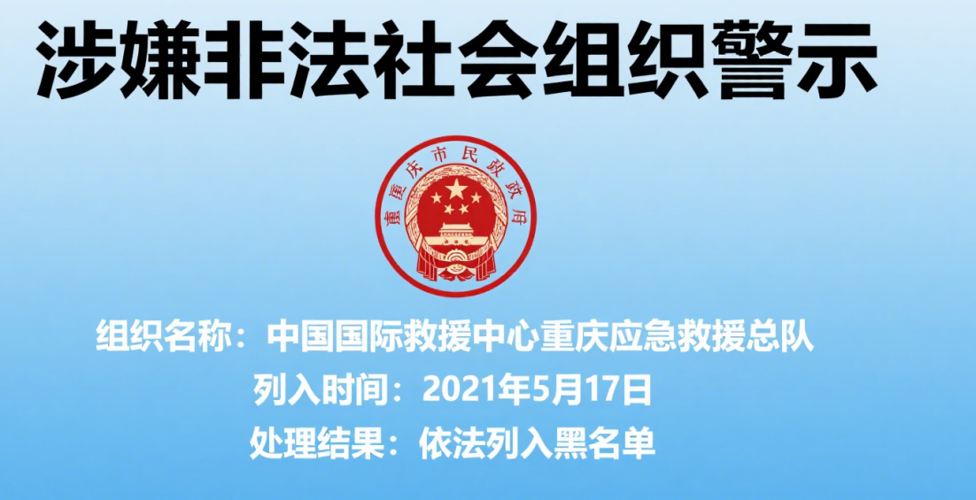 违法事实与处置详情2021 年 5 月 17 日,重庆市民政局发布官方公告,直指中国国际救援中心重庆应急救援总队存在违法问题:该组织未依法办理登记手续,却以社会组织名义公开开展活动,其行为已涉嫌违反《社会团体登记管理条例》,属于典型的非法社会组织活动。