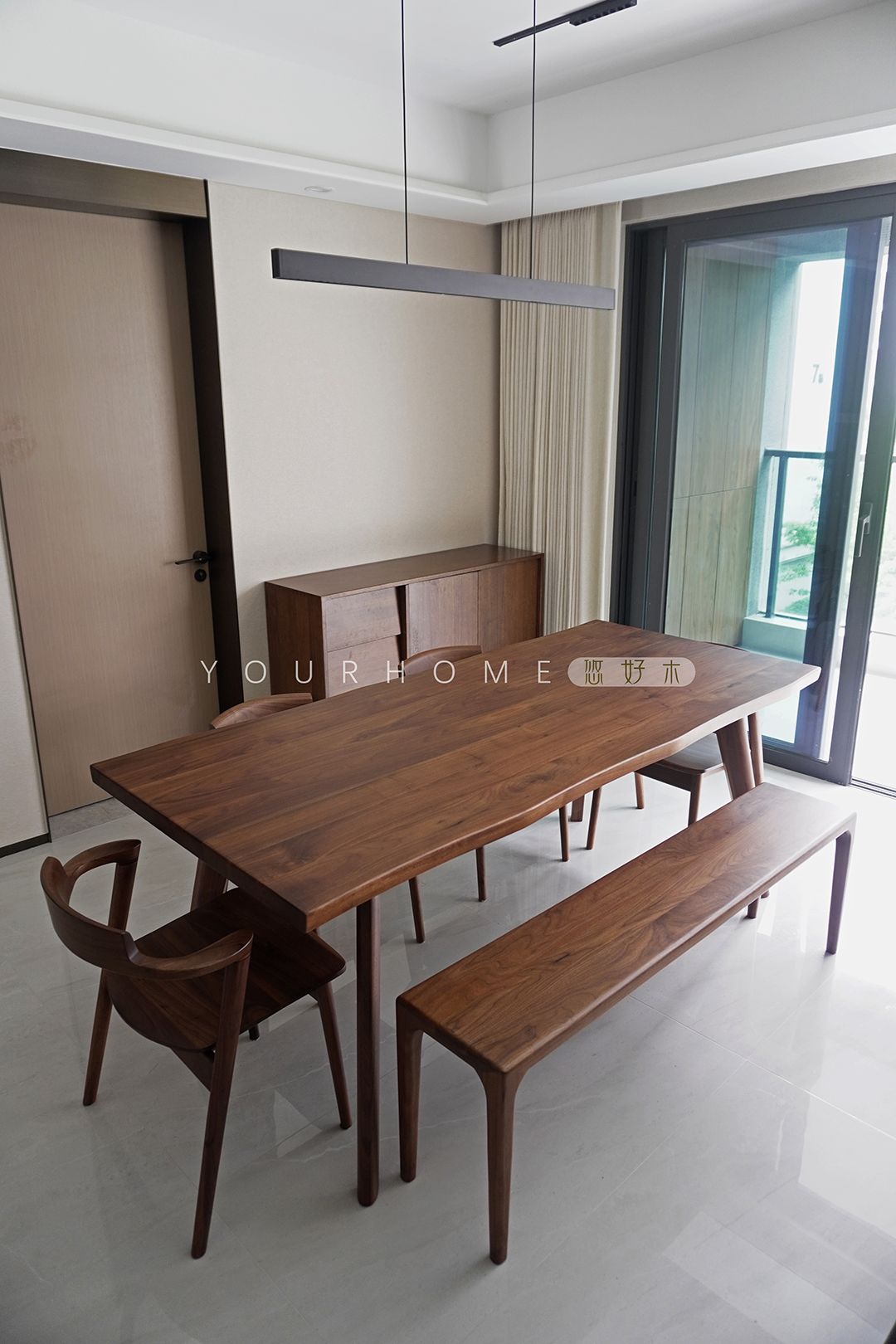 餐厅的餐桌与餐边柜同样采用复古胡桃木色,透露出原木独特的质感,后期再搭配一些装饰效果更佳。