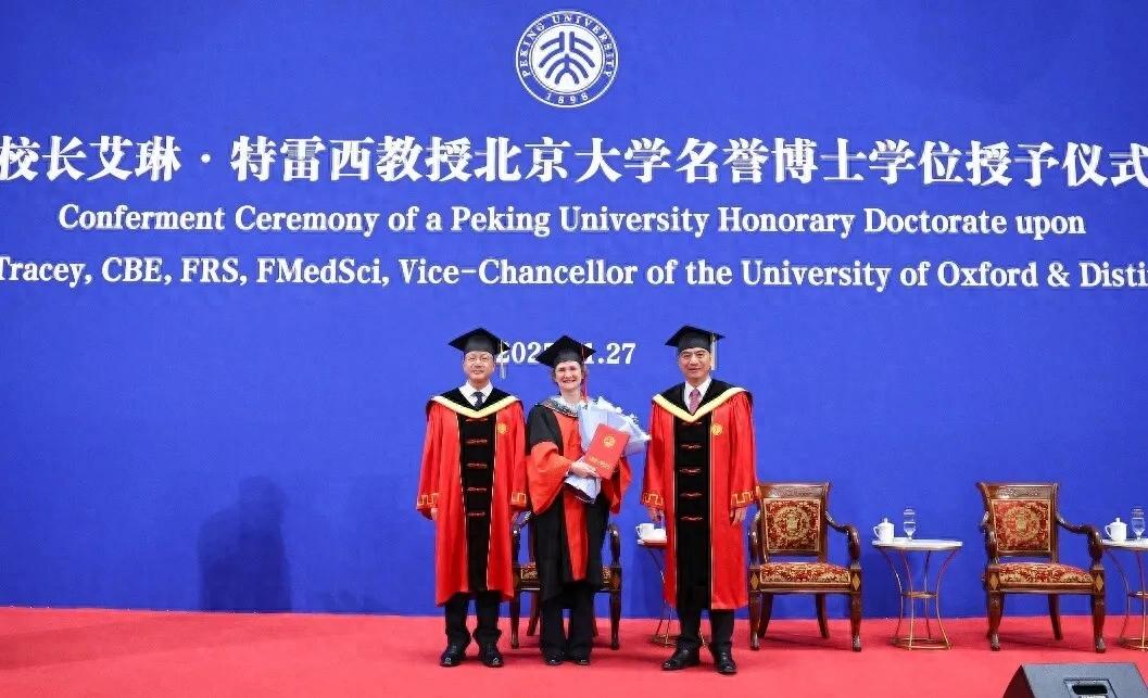 北京大学11月29日消息,11月27日,英国牛津大学校长艾琳·特雷西(Irene Tracey)率代表团访问北京大学,被授予北大名誉博士学位并发表主旨演讲。