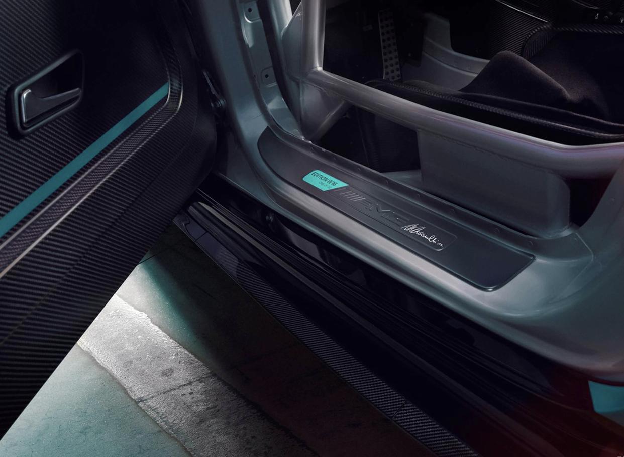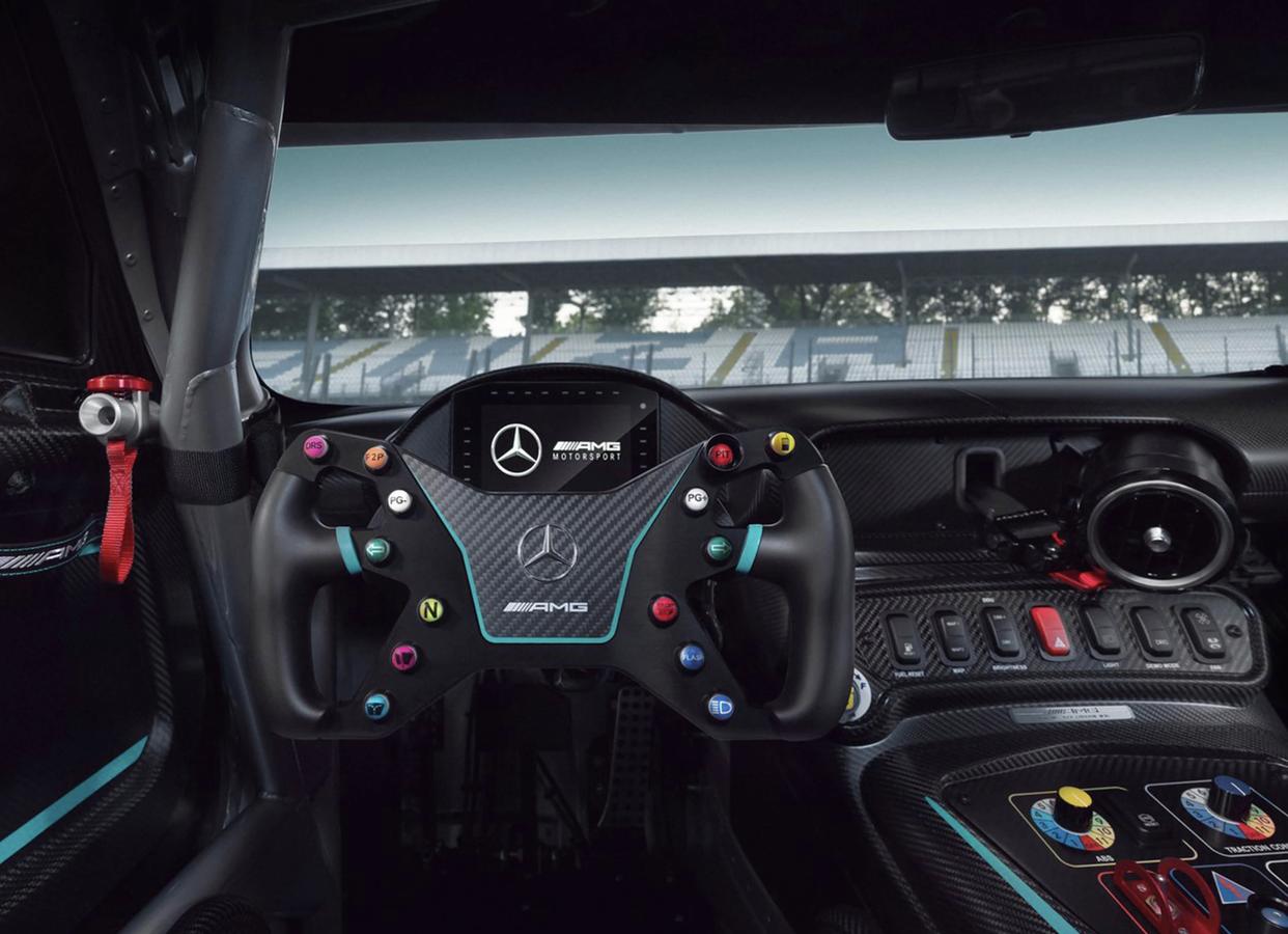 AMG GT2 Edition W16的车内是一切以驾驶者为中心的设计,即便是一台偏向于赛道和性能取向的车型,车内的做工、用料和配置却依然是顶级豪车的水准该有的配置一样都不缺。车内采用了大面积灰色Alcantara面料和大量哑光碳纤维材质,并在座椅、车门和中控台等处加入绿色点缀呼应外观。中控台完全照搬了GT2赛车,取消了很多冗余的设计,取而代之的是方向盘上左右各7颗,一共14个不同颜色的按钮,采用了全新DINAMICA防滑材料包裹。操控岛区域也变得更加简约,加入了排列整齐的大尺寸长条按键,还有旋钮。另外包括桶形座椅、防滚架和安全网等设置也均与赛车保持一致。车内还会拥有Kimi Antonelli亲笔签名以及1of30专属限量徽章。