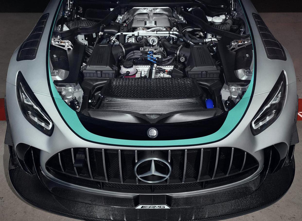核心部分,AMG GT2 Edition W16将依旧搭载4.0T V8双涡轮增压发动机,其最大功率707马力,在Push2Pass模式下,最大功率可提升至830马力,峰值扭矩可达1000牛·米。传动系统匹配了AMG赛车专用的6速序列式变速箱,通过碳纤维传动轴将动力传递至后轮,另外还配备4向可调赛车减振器。还配备了带有自适应阻尼调节的AMG RIDE CONTROL悬架、后桥电子差速器、带有红色刹车卡钳的AMG高性能刹车,让这台超级跑车即拥有更加极致的加速和更高的极速,还能刹得住。该车重量仅为1430公斤,功率重量比为1.7公斤/马力。