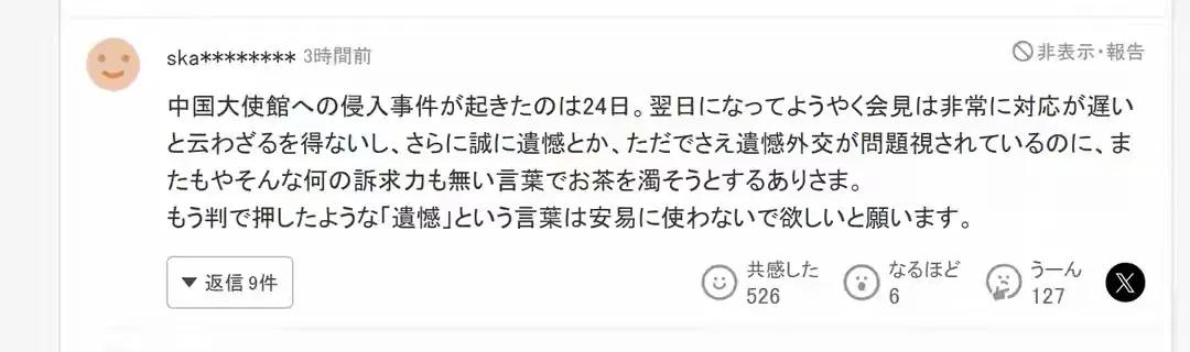 有人愤怒地写道:“直到第二天才召开记者会,不得不说应对非常迟缓。而且还使用‘遗憾’这样的说法,本来‘遗憾’就已经饱受诟病,如今却再次用这种毫无说服力的措辞来敷衍了事。” 这种对官方措辞的强烈反感,反映出民众对政府公信力的严重质疑。
