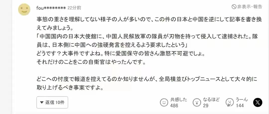 在雅虎日本等平台的评论区,大量日本网民并没有为这名自卫官叫好,反而表达了强烈的恐惧和不满。他们批评政府用“遗憾”搪塞,指责媒体回避报道,更有人尖锐地指出,这种行为已经越界,是“典型的恐怖行为”。