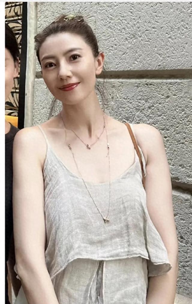 高圆圆身穿一件亚麻色的连衣裙,宽松版式的,随风飘扬很美很仙,她的头发随意扎起,就如同仙女一样。