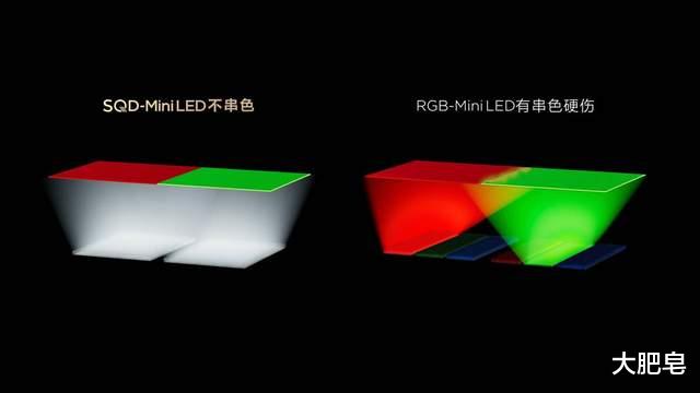 但现实观看内容是动态且复杂的,短板立刻暴露:传统RGB-Mini LED依赖"三色先混白再滤色"的妥协方案,当电视画面变复杂时,需要先把各种光混成白光,再靠屏幕色阻滤色,背光源的灯控精度跟不上,不同颜色的光互相串门,串色混色画面色彩就不纯净了。