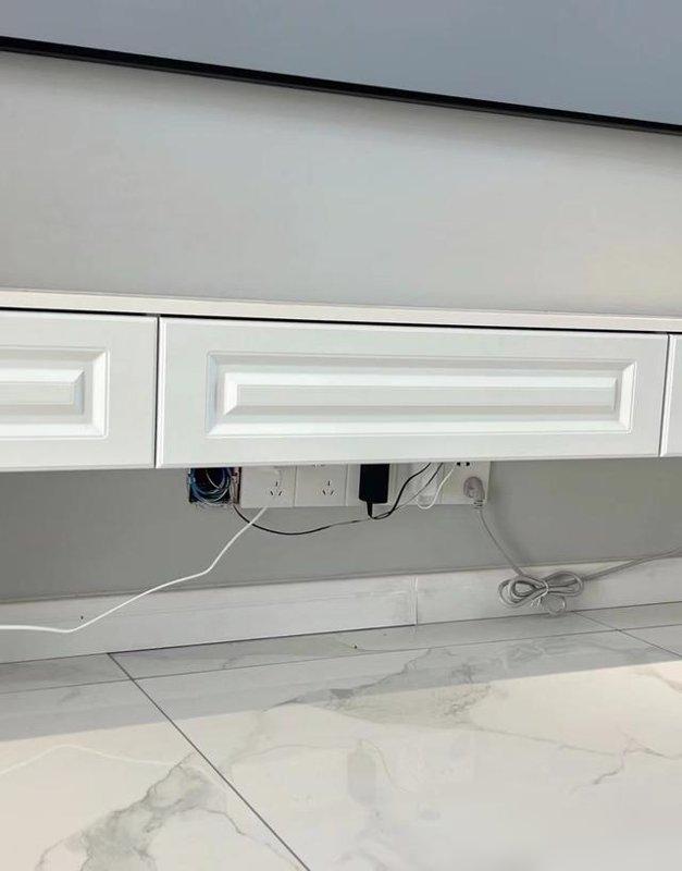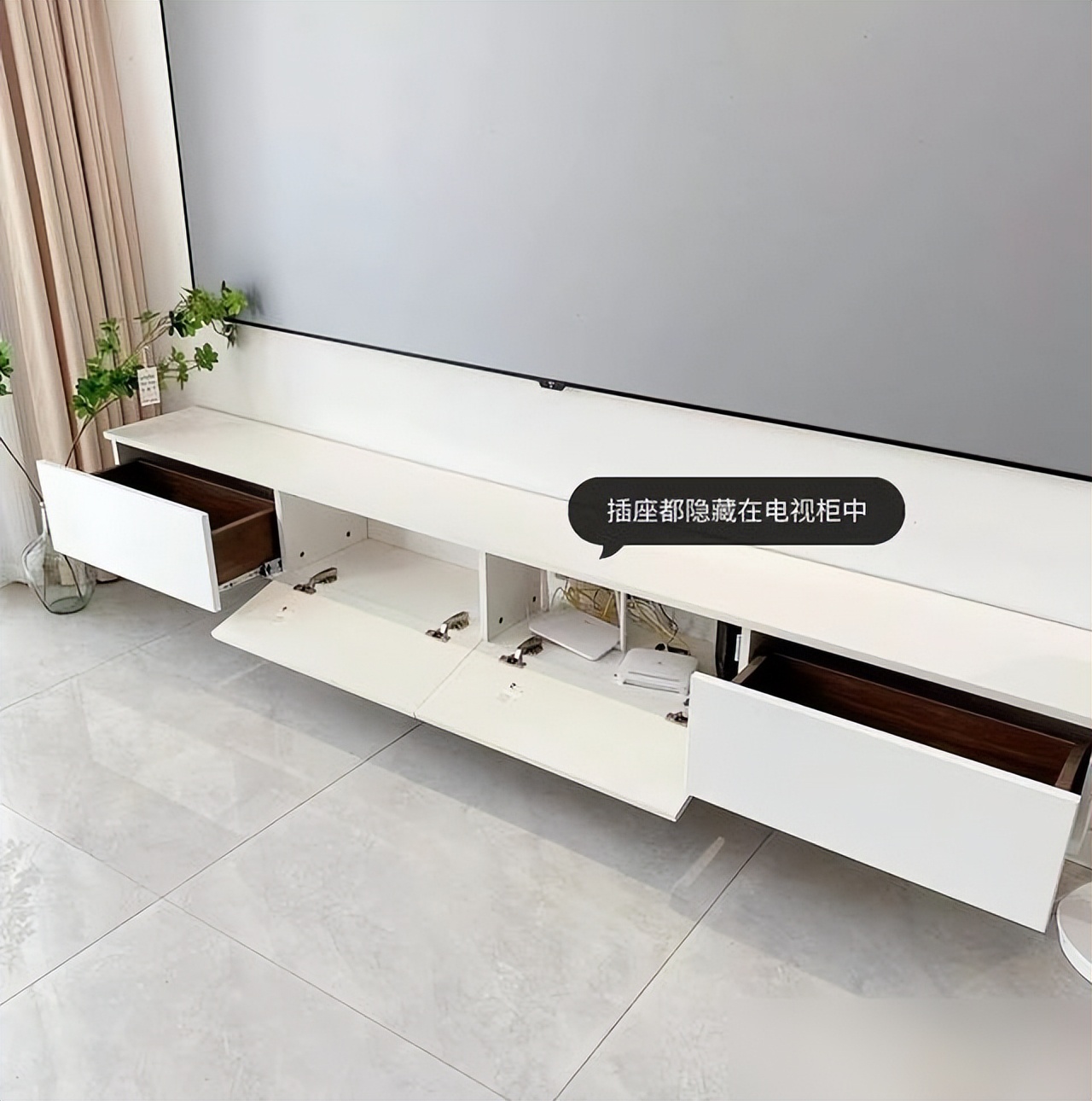 底下藏着灰,扫地机器人进不去,蹲那擦地能累出腰间盘突出;悬空的多好,离地20公分正好让机器人自由穿梭,电线、机顶盒、甚至先生的游戏手柄全藏在柜子里,台面连个充电头都没有,看着就清爽。
