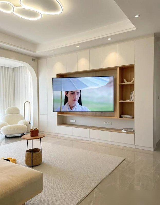 孩子的绘本、妈妈的吸尘器、甚至过年的对联福字,全塞进去,客厅瞬间从“垃圾场”变“样板间”。而且要做就做顶天立地的,进深30-35公分正好装下吸尘器和100寸电视——别嫌预留100寸麻烦,现在电视越做越大,你今年买55寸,明年说不定就想换75寸,预留够尺寸,以后根本不用砸墙。我朋友家的满墙柜,特意留了100寸的位置,今年换了98寸电视,正好嵌进去,她说“幸亏没做固定尺寸,不然现在得哭着砸墙”。