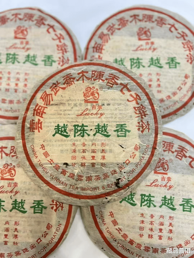 2004年吉幸越陈越香,也是吉幸早期精品茶之一,有一生一熟两款产品,版面几乎一样,生茶的“越陈越香”字样为绿色,熟茶的为棕色,很容易辨识。
