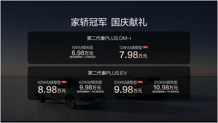 除了上新和OTA,为回馈广大用户的热爱,第二代秦PLUS带来国庆献礼价,全系车型限时6.98万元起,入门即享新车色、车载ETC、NFC钥匙、智能语音、VTOL移动电站等高端配置,将高品质家轿的门槛拉进了6万区间,为进取向上的中国家庭献上了一份国庆厚礼。