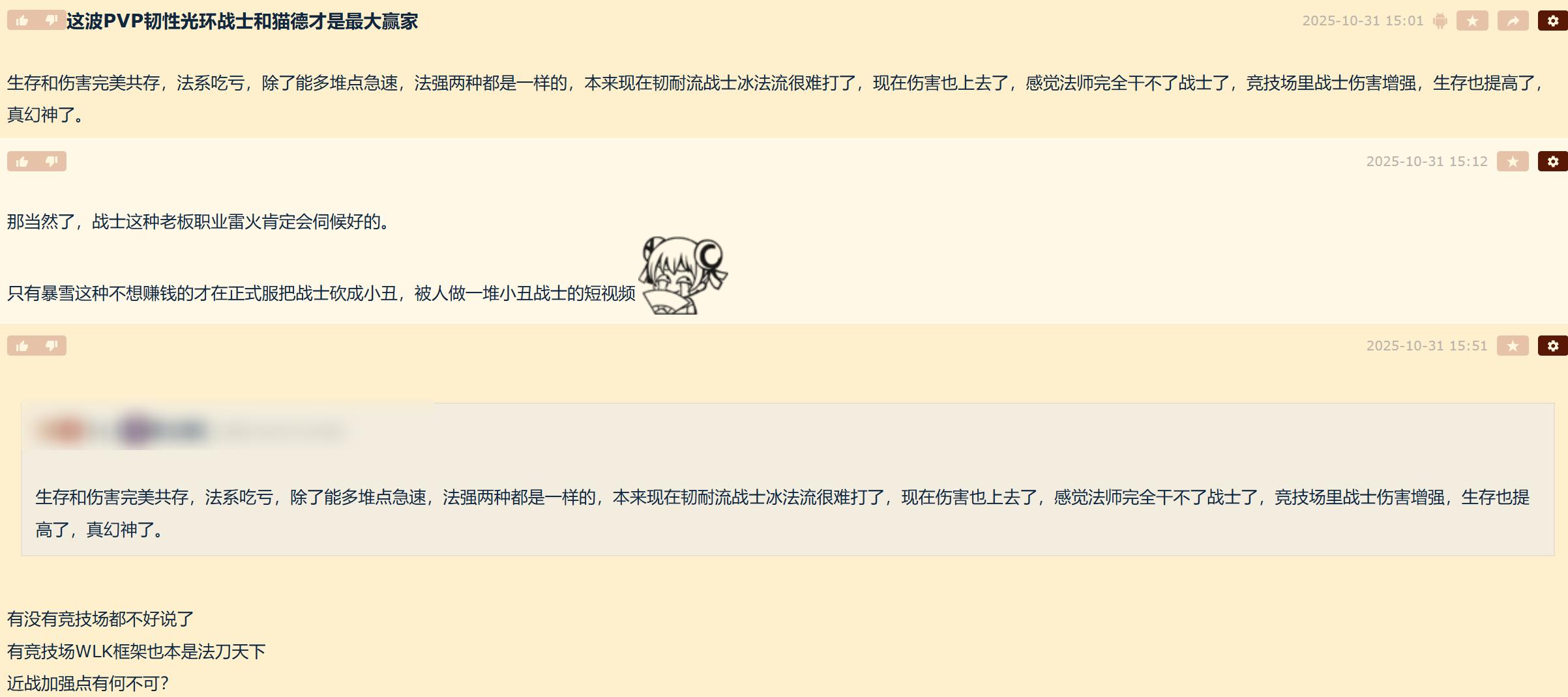 而其他的职业就没有那么舒服了。毕竟增伤害和减伤确实只有战士可以完全受益,而其他职业在这个新版本中会有点捉襟见肘。但是目前还没有看见平衡的方案,我们一眼能发现的问题,官方估计也能发现。不过WLK就是法刀的天下,说不定因为这样导致了战士玩家消费不同,那么这个版本加强一下,好像也无可厚非。