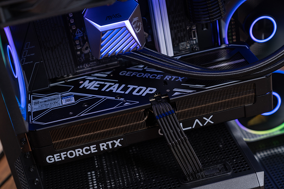 显卡则采用影驰 GeForce RTX 5080 金属大师 黑金版 OC显卡,NVIDIA最新的Blackwell架构,核心编号为GB203-400,拥有10752个CUDA核心,加速频率为2655MHz,16GB 超大容量GDDR7 显存,显存频率高达 30Gbps,采用新一代金属大师寒光星β散热系统。无论是3A游戏还是生产力环境都轻松应对。