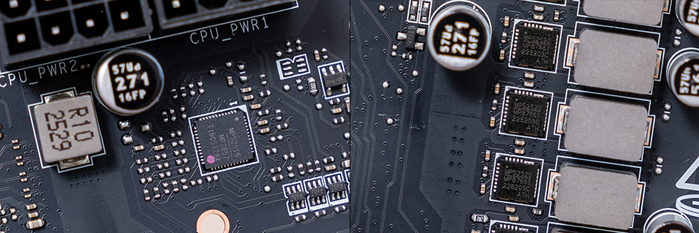 为了保证供电模组能稳定运行,VRM散热装甲配备了多层叠加的金属散热鳍片,通过扩大散热表面积以增强热传导效率。供电模组与散热基座接触面敷设7W/mk高导热系数导热介质,有效提升热交换速率及系统持续负载能力。