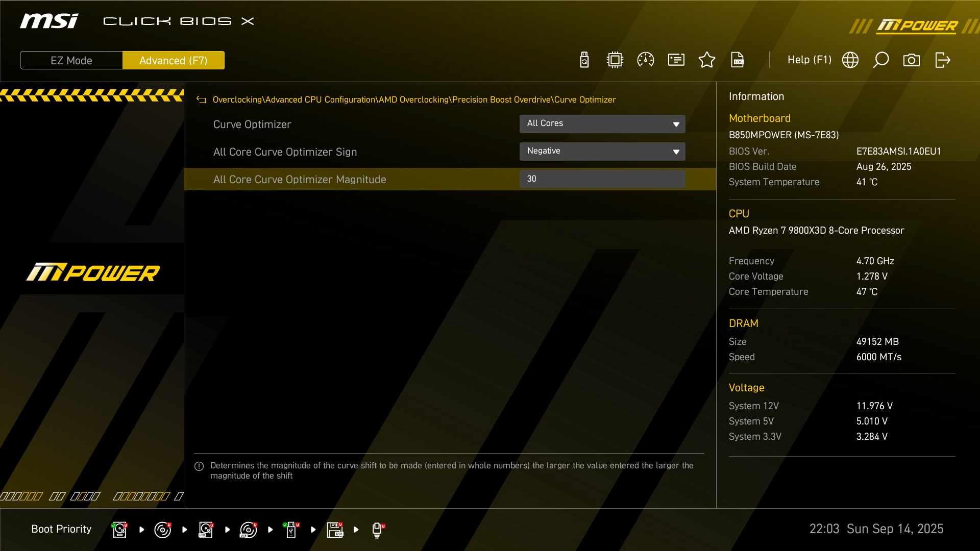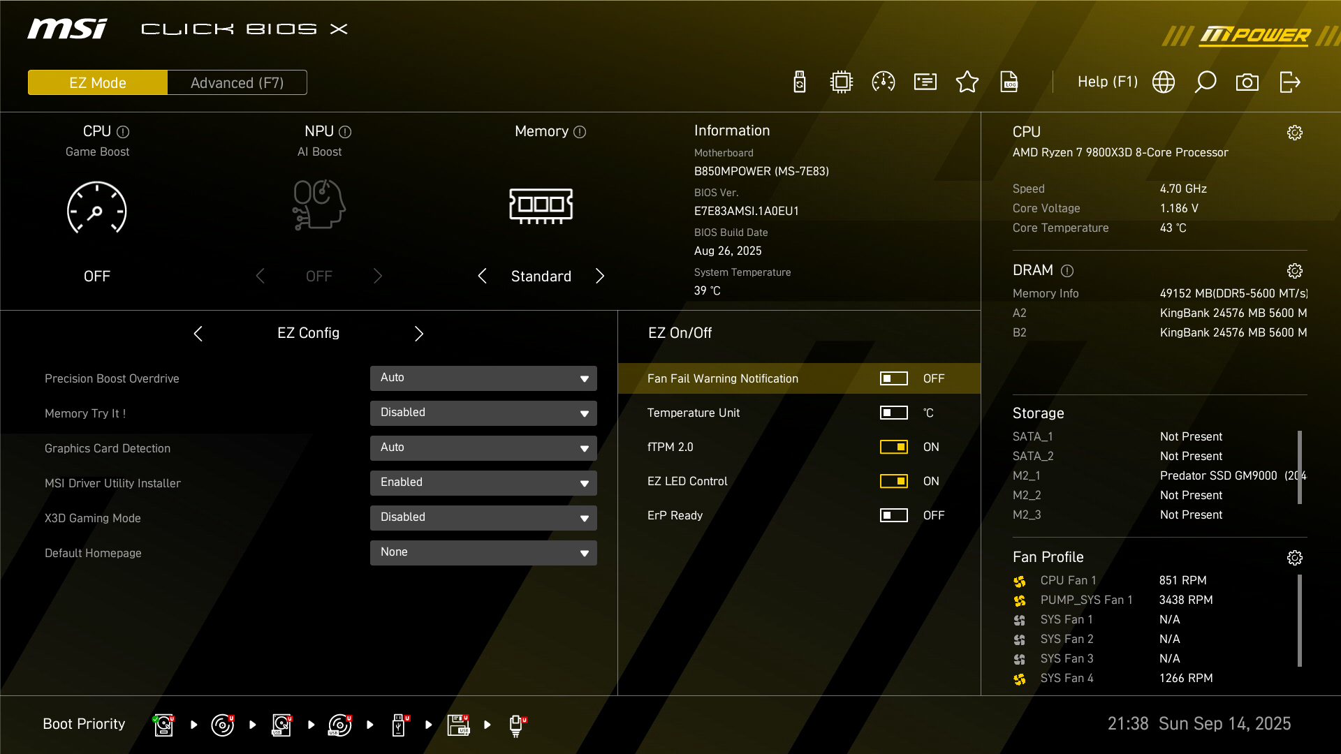 微星针对MPOWER系列设计了全新的CLICK BIOS X 界面提供美观更友善使用体验,让玩家可以更快速存取和调整系统配置。分辨率直接提升至1080P。默认为EZ Mode 简易模式,一般玩家只要在此模式下就可以完成许多设定,例如开启 XMP 、AI BOOST、Game Boost,甚至是 MSI Performance Prest 、Memory Try it等功能,操作便捷。