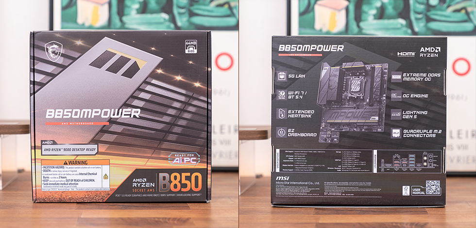 微星 B850MPOWER 主板的包装采用了一贯的黄黑警戒配色,正面只有MPOWER 的铭牌渲染图以及型号名称。在下方则标注了“AMD RYZEN 9000 DESKTOP READY”、“AMD B850”以及“READY FOR AI PC”标识,包装背面则是产品图以及主要特征和参数介绍。