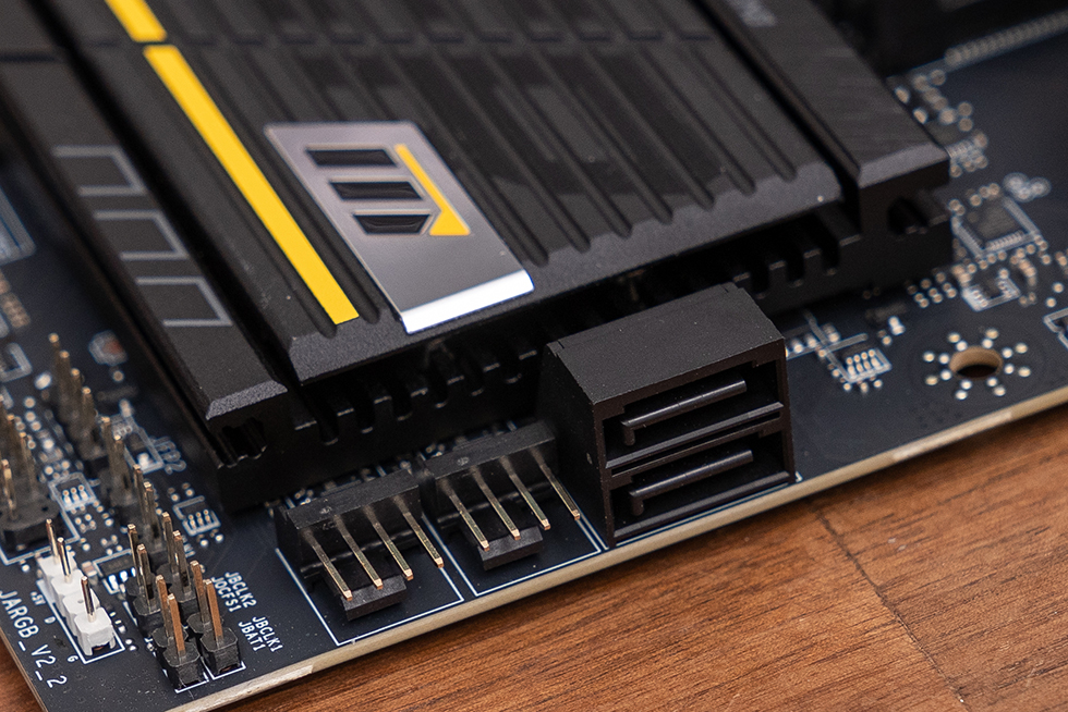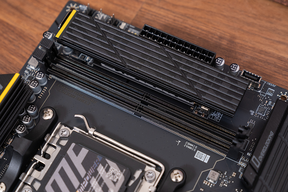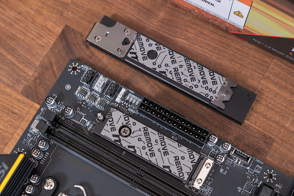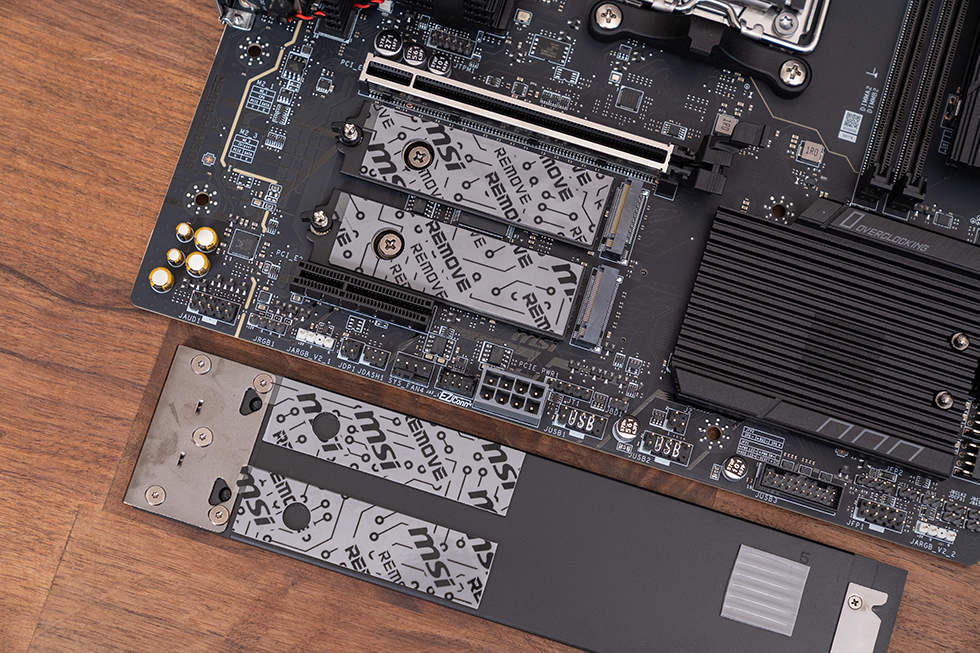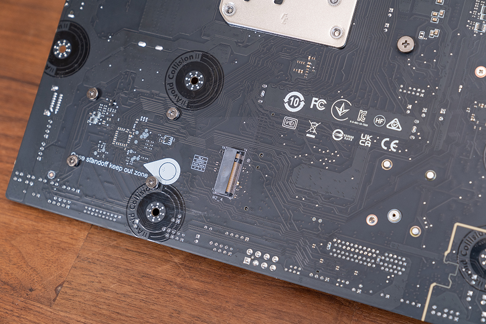 下方的M.2_1和M.2_3两个槽位共用一块大型第二代免工具M.2冰霜铠甲,其中上面的M.2_1槽位来自CPU,为PCIe 5.0 x4规格,下方的M.2_1槽位来自芯片组,为 PCIe 4.0 x4规格。背面的M.2_4槽位,同样来自芯片组,但是规格上为 PCIe 4.0 x2。