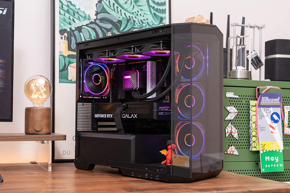 既然是MATX规格的主板,肯定要使用MATX机箱来搭配,本次使用的就是微星旗下MAG PANO M100R PZ,标准的中塔ATX机箱,整机尺寸为440x235x405mm。在一众同质化严重的海景房机箱中,特别是在45°视角下270度不规则的切面造型的无立柱设计十分具有辨识度。