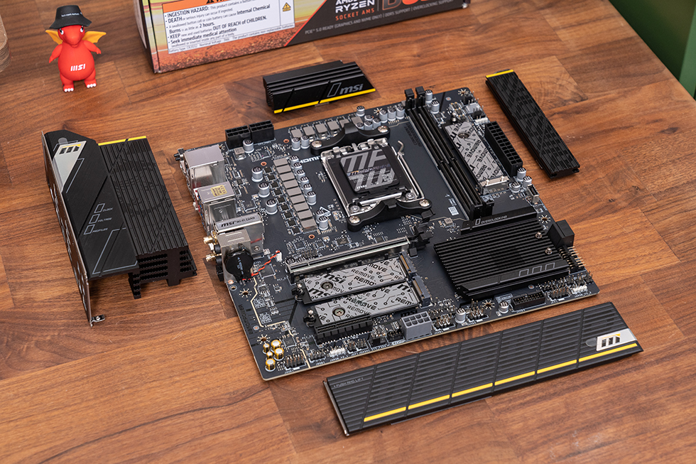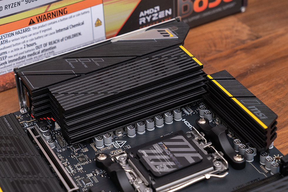 得益于双槽的设计,内存在PCB空间上有了多余的空间,在内存边上多了一条M.2的槽位,加上下方的2个M.2槽位和背面1个M.2槽位,微星 B850MPOWER 主板一共为用户提供了4个M.2槽位。其中内存边上的M.2_2槽位为PCIe 5.0 x4规格,默认来自CPU,自带独立的第二代免工具M.2冰霜铠甲。正面的3个槽位均为快拆设计,装甲背面和槽位底部均带有散热片。