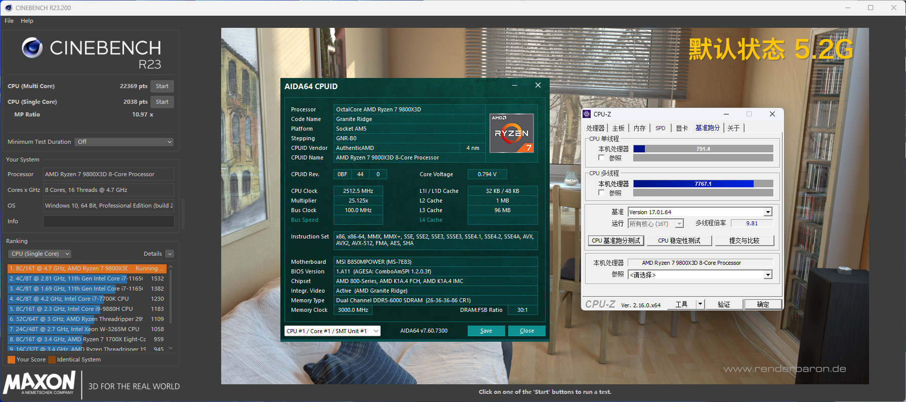 【默频 5.2Ghz】首先是默认5.2Ghz状态下,R23多核跑分为22369,单核跑分为2038;CPU-Z基准跑分单线程为791.4,多线程跑分为7767.1。