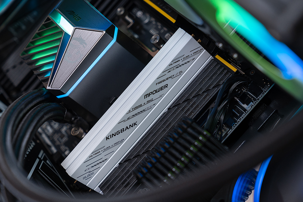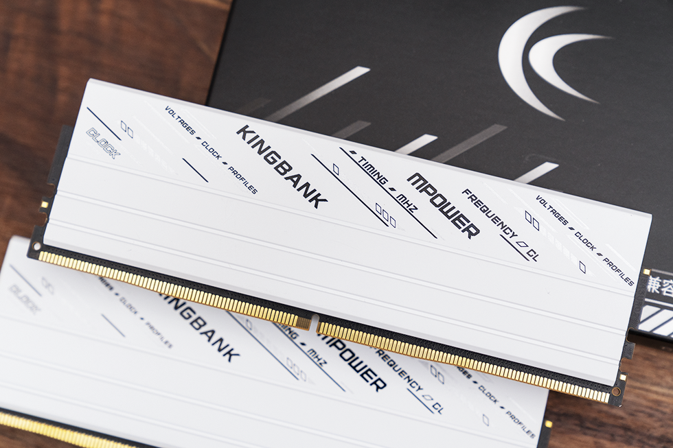 内存外观采用全新设计,散热马甲表面带有KINGBANK和MPOWER斜纹LOGO,马甲表面正面多条直通凹槽,增加散热面积,形成微风道。采用了2mm高厚度金属马甲与5W 导热硅脂加持。硅脂导热系数高达 5W/(m・K) ,远超普通导热材料,能迅速将热量传导至散热马甲,实现高效散热。