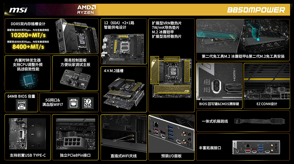 微星 B850MPOWER 主板采用 12+2+1 供电模组;支持最新AMD 锐龙™ 9000系列台式处理器,双DDR5 插槽搭配锐龙8000系列cpu,內存至高超频至10200+MT/s;内置时钟发生器,64MB大容量BIOS,微星性能切换设置(Performance Switch)。配备扩展型VRM散热片 / 7W/mk高效能导热贴 / 电感导热垫片 / M.2 冰霜铠甲,强化散热性能。