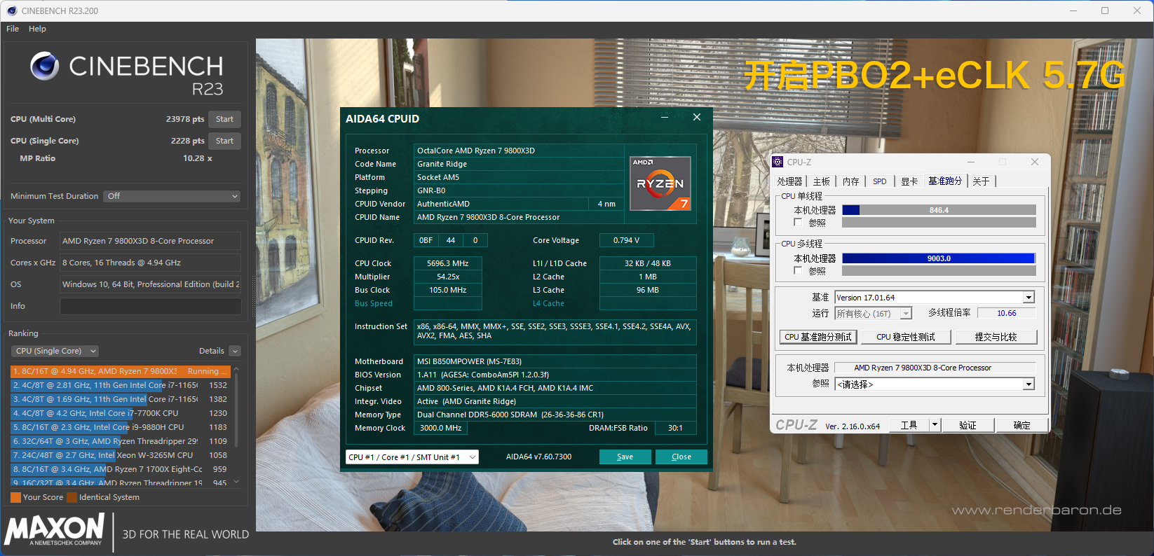 【PBO2+eLCK 5.7Ghz】微星 B850MPOWER 相对一般的B850M主板来讲,多了内置的时钟发生器,所以可以对CPU进行外频进行调节,就以9800X3D为例,开启eCLK Mode后,选择异步模式,外频可以一般在105-107范畴之内,极品体质也可以到108或者109,大家可以根据自己手上的CPU体质而定,我这里直接以最为稳妥的105为例。开启后主频达到了5.7Ghz,此时R23多核跑分为23978,单核跑分为2228;CPU-Z基准跑分单线程为846.4,多线程跑分为9003。相较于默认状态,性能分别提升了7.19%、9.3%、6.95%、15.91%